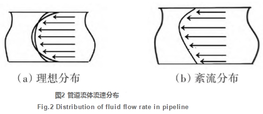 (2)在圓形管道中流體充分發(fā)展后,管道中間的流速比較均勻,但是管壁處流速梯度較大。圖2(a)為理想流速分布,當雷諾數(shù)較小時弧度較大,對應(yīng)流速差別也大。但由于現(xiàn)場管道安裝復(fù)雜(例如有大量彎管、閥門等),實際流速分布如圖2(b)所示。若流速越低,則不同位置流速差異越速同時伴隨著素流或渦流產(chǎn)生,所以在實際應(yīng)用中管道內(nèi)平均流速很難準確測得。