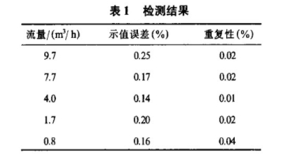 該電磁流量計(jì)已經(jīng)得到應(yīng)用,并依據(jù)JJG198-94《速度式流量計(jì)檢定規(guī)程》,利用質(zhì)量法水標(biāo)準(zhǔn)裝置,對采用基波平均值信號預(yù)處理電路的電磁流量計(jì)進(jìn)行檢定,重復(fù)性誤差為0.1%,基本誤差為0.25%,線性度0.3%,檢測結(jié)果如表1.